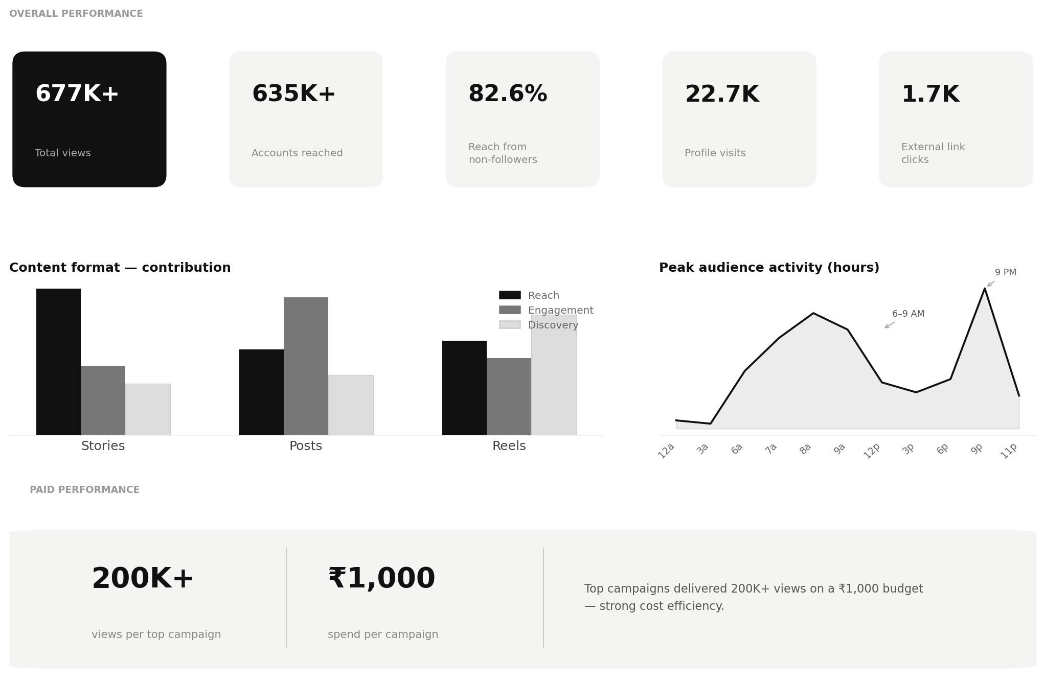 Stories contributed most to reach, posts drove engagement, and reels supported discovery with room to evolve into deeper formats.